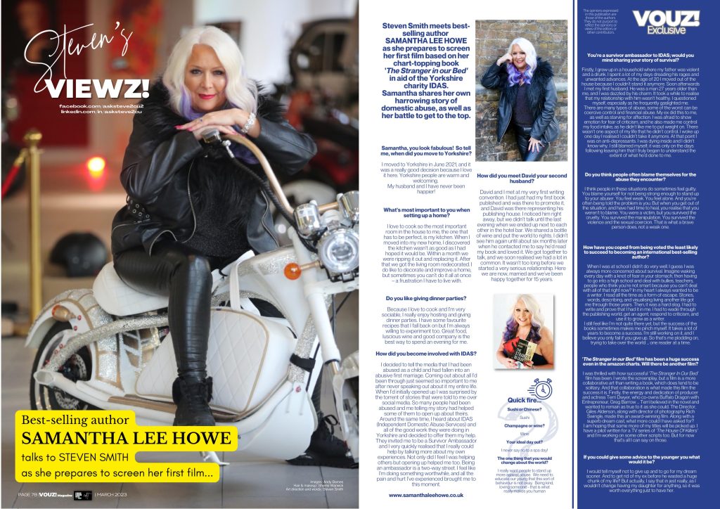 Samantha is also in demand in broadcasting for her wit and down to earth opinions. In addition she has become a survivor ambassador for IDAS, the Yorkshire domestic abuse charity.